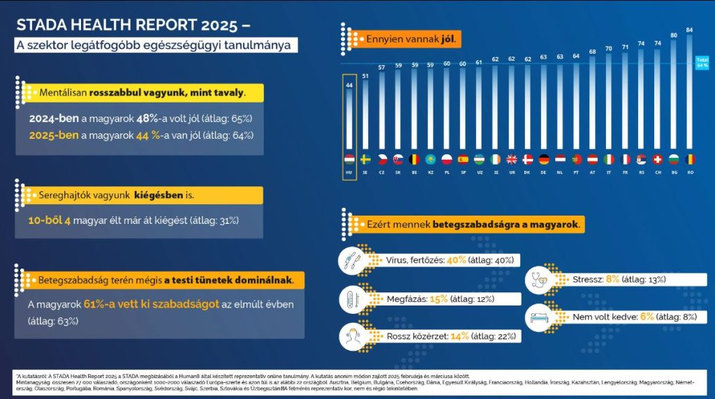 A STADA Health Report 2025 adatai alapján a kiesett munkanapok elsődleges oka Magyarországon a vírusos vagy fertőző megbetegedés, és nem pedig lelki okokhoz köthető. Feltűnő az is, hogy a mentális egészség hiánya és a kiégés ellenére a riport alapján a magyarok valamivel kevesebb arányban mentek betegszabadságra az elmúlt évben stressz és rossz közérzet miatt, mint a vizsgált országok átlagában.