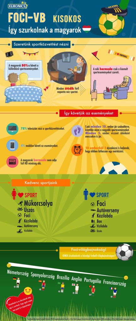 Valóban sportnemzet vagyunk, pláne, ha nem sportolásról, hanem szurkolásról van szó. A magyarok több, mint 80%-a eltérő gyakorisággal, de követi a különböző sporteseményeket, a legnépszerűbb sportág a futball. A közvetítéseket elsöprő többségben televízión nézzük, és a lakosság harmada nem adja full HD minőség alá, derült ki az Euronics Műszaki Áruházlánc legfrissebb felméréséből*. A hamarosan induló labdarúgó-világbajnokságon a legtöbben a spanyoloknak és németeknek szurkolnunk majd. De hogy emellett sportolni is hajlandók vagyunk-e? Az Euronics felmérése erre is rámutat!
