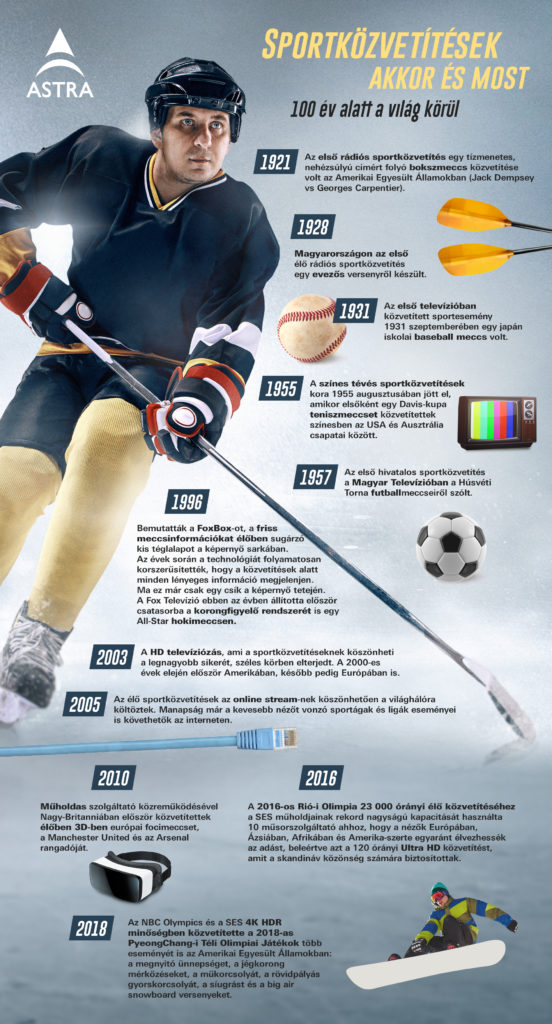 Az egész világon vannak még viták arra vonatkozóan, hogy ki is közvetített először egy sporteseményt, egy dologban azonban biztosak lehetünk: a sportközvetítés műfaja az 1890-es években született meg, amikor a játékokról szóló beszámolókat még távírók segítségével közölték. Az első sportközvetítések között pedig egy kanadai hokimeccs is helyet kapott, amit a Montreal és a Winnipeg csapatai között rendeztek. Ma, amikor Budapest a jégkorong egyik legrangosabb eseményének ad otthont, a SES Astra műholdas szolgáltató 10+1 pontban összegyűjtötte a sportközvetítés fejlődésének legfontosabb állomásait.